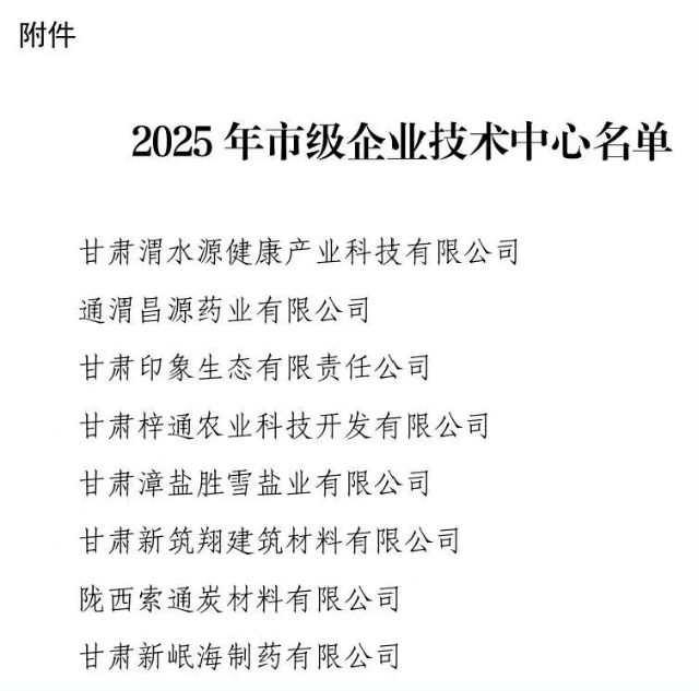 近日,市工信局公布2025年市级企业技术中心名单,甘肃渭水源健康产业科技有限公司等8家企业成功入选,标志着定西市在强化企业技术创新主体地位、推动产业转型升级方面又迈出了坚实的一步。